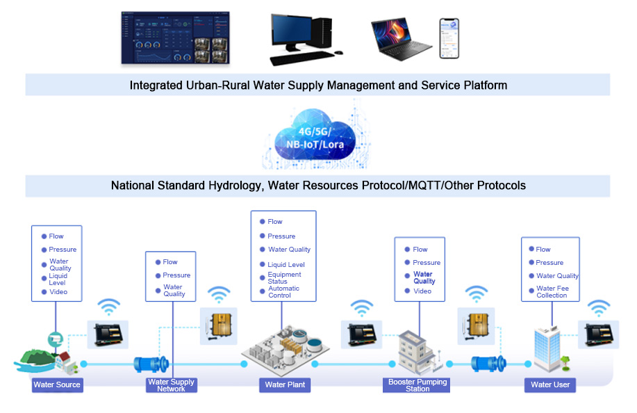 The urban-rural integrated water supply service platform enhances the efficiency and quality of water supply services by establishing a "supervision + service" framework, providing practical and convenient water supply services for users. The platform can also predict water demand, monitor water quality changes, identify and resolve potential issues in advance, and improve emergency response capabilities. The urban-rural integrated water supply service platform not only improves the stability and safety of water supply but also contributes to socio-economic development and enhances residents' quality of life.
